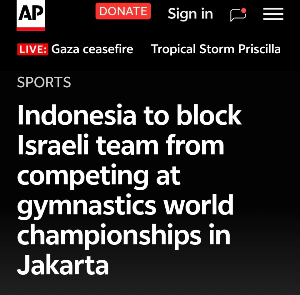 就这样,即便巴以冲突双方已经同意停火,但以色列代表团依然不被获准进入印尼。这就意味着,他们将无缘10月19-24日在雅加达举行的单项世锦赛。