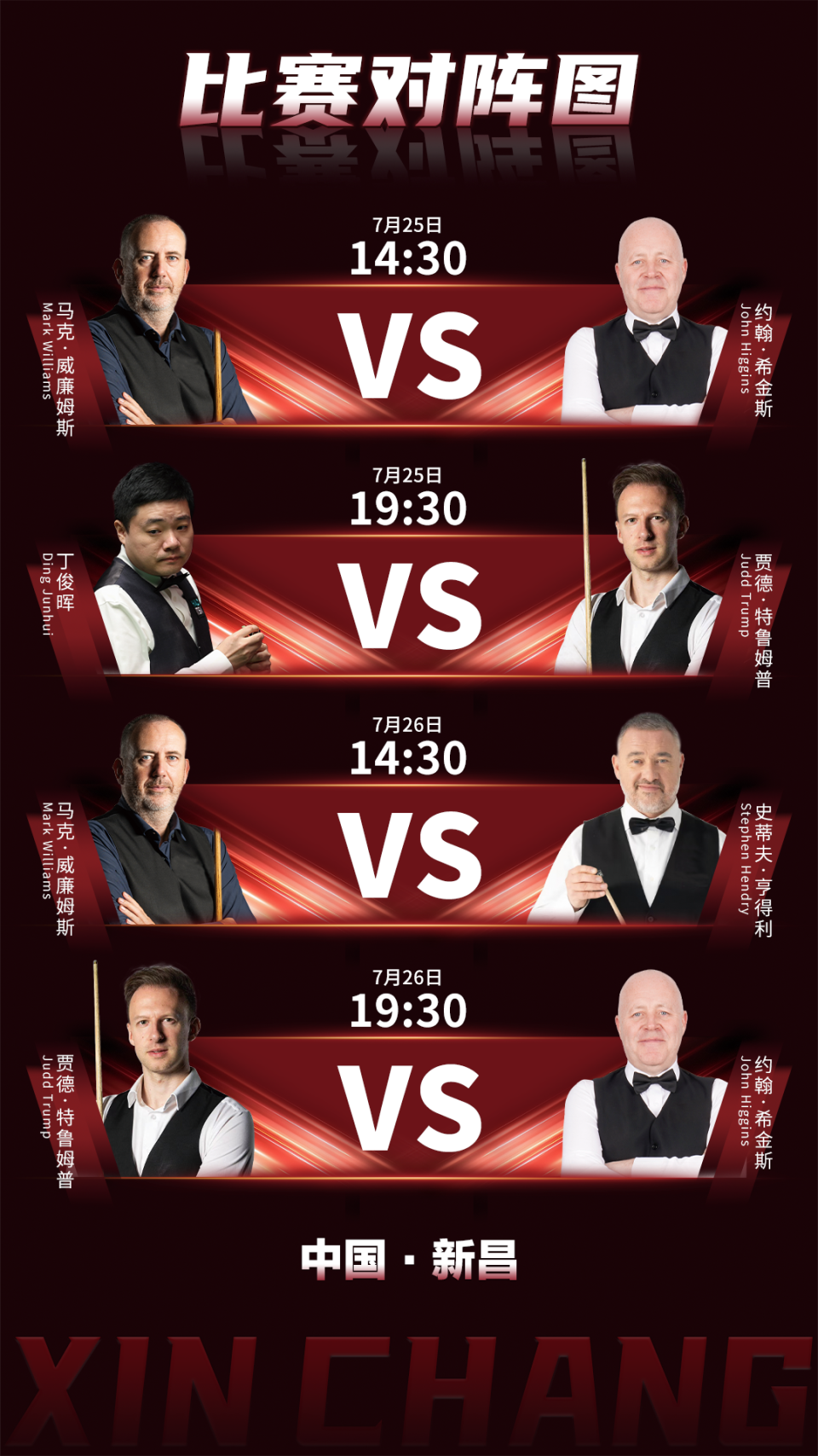 7月25日14:30,世界排名第三的马克·威廉姆斯将对阵世界排名第四的约翰·希金斯;19:30,“中国龙”丁俊晖将对阵“The Ace”贾德·特鲁姆普;史蒂夫·亨得利也将在后续的比赛中亮相……五大球星将以精湛的球技,为观众呈现一场场集竞技性与观赏性于一体的斯诺克盛会!